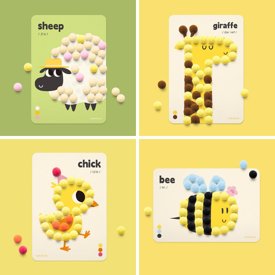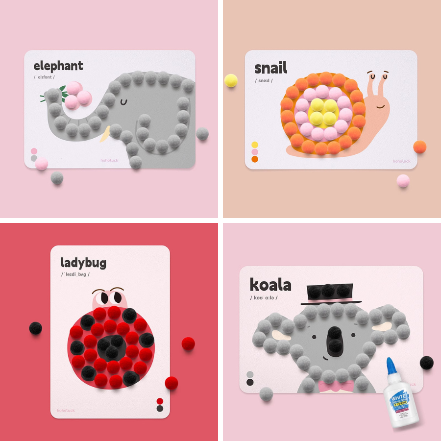 Hộp sáng tạo từ pompom của nhà Hoholuck với 8 bức tranh động vật đáng yêu để trẻ tự tay gắn pompom trang trí. Bạn nhỏ có thể gắn theo mẫu hoặc sáng tạo theo cách riêng của mình. Các ba mẹ hãy khuyến khích và chơi cùng con nha ^^