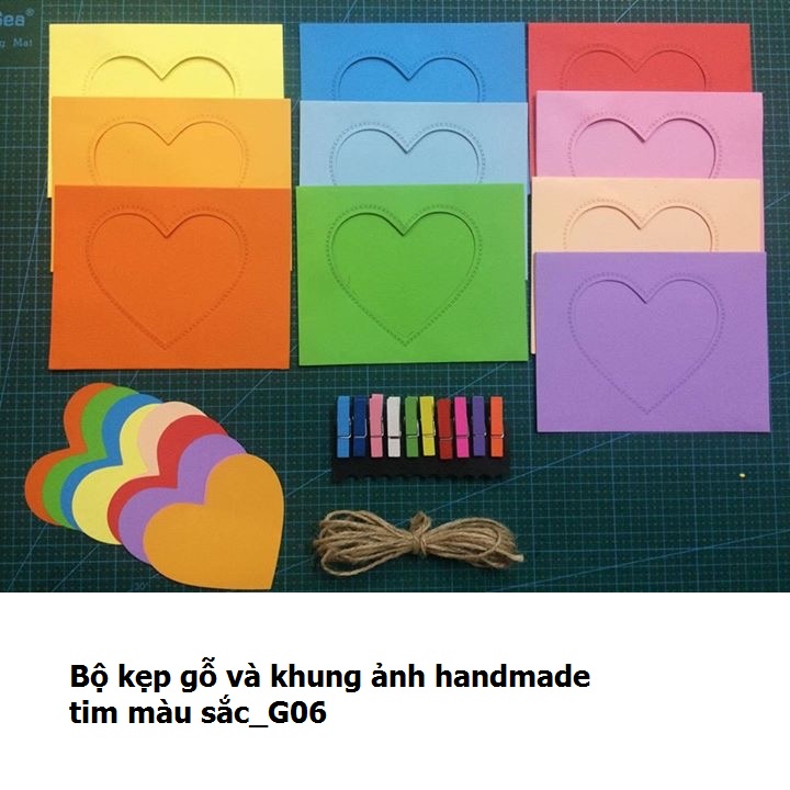 Sản phầm gồm 10 khung ảnh hình tim, 10 kẹp gỗ sắc màu, 2m dây gai.
