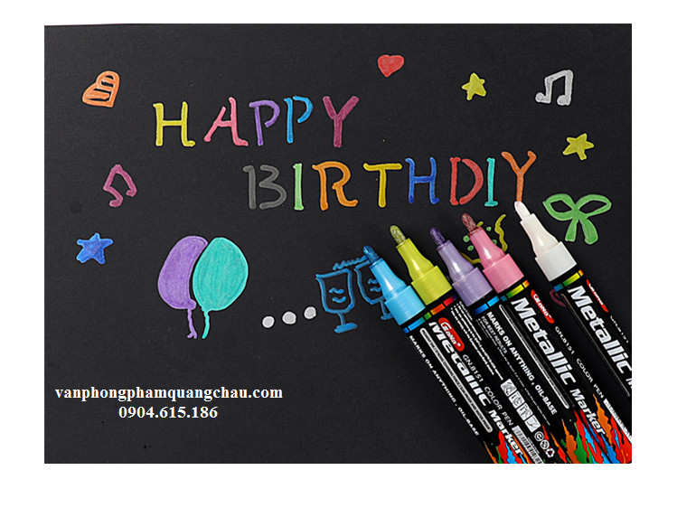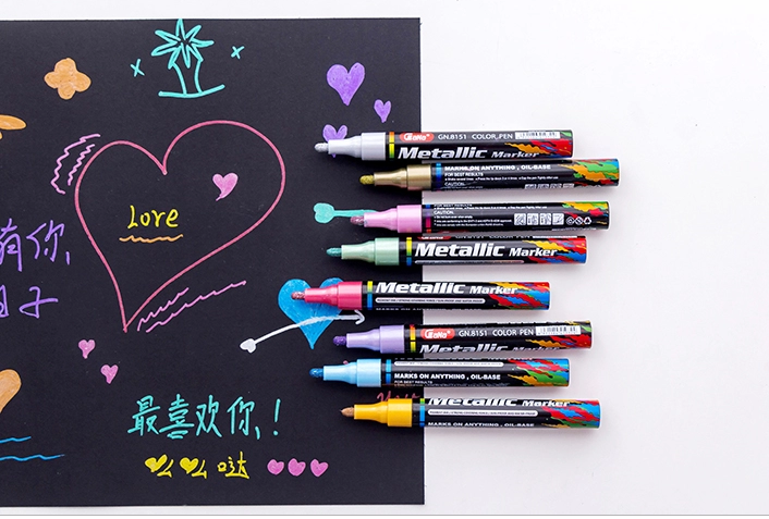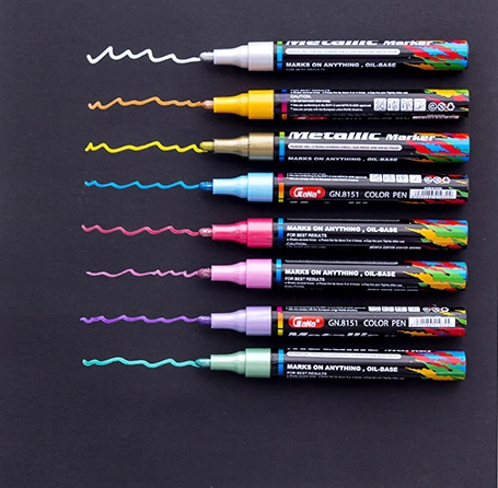 Bút đánh dấu Metalíc nét 2mm là loại bút có có mực ánh kim tuyến, nổi bật khi vẽ, đánh dấu trên bề mặt tối màu, viết được trên mọi bề mặt: Kim loại, Cao su, Gỗ, Vải, Thuỷ tinh, Nhựa,nylon …..dạng oil base nên có khả năng chống thấm nước , chịu nhiệt độ cao và đặc biệt là không xoá được