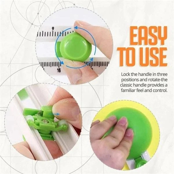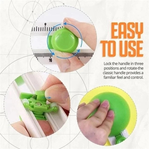 Hoạt động tương tự compa cắt vòng tròn, nhưng được thiết kế lạ mắt và dễ sử dụng hơn. Điều chỉnh kích thước vòng tròn cần cắt, đặt dụng cụ lên mặt vật liệu cần cắt và xoay tay cầm để cắt. - Kích thước: Chỉ cắt được vòng tròn kích thước lớn, đường kính từ 10cm – 32cm - Sản phẩm đi kèm 02 lưỡi dao thay thế