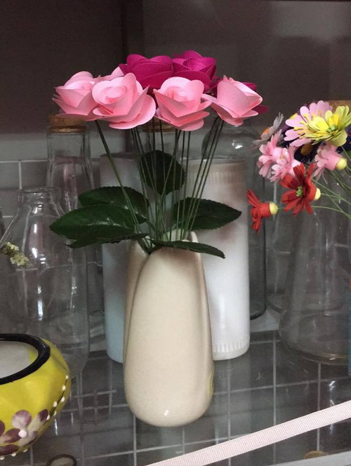 Sản phẩm bao gồm 1 lọ sứ cao 11cm và 15 bông hoa kèm lá nhựa