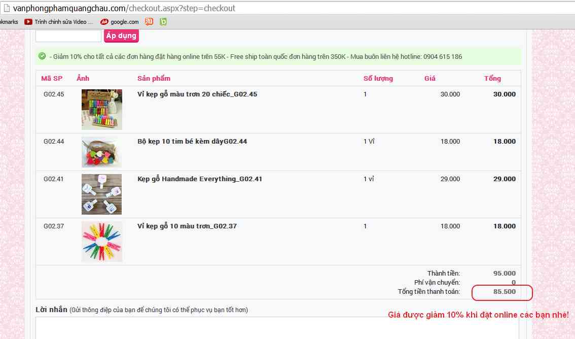 Mỗi đơn hàng thanh toán Online được chiết khấu ngay 10% trên toàn quốc. Đơn hàng tối thiểu trên 55K các bạn nhé!