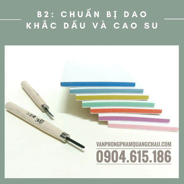 B2: Nguyên liệu là không thể thiếu: dao khắc dấu, cao su, mực dấu và giấy can (chất giấy trong để bạn in hình họa tiết)