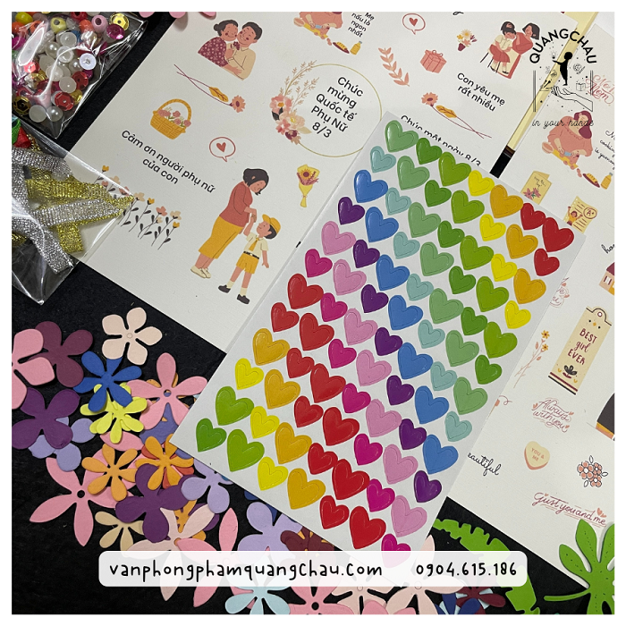- Hạt gỗ, ngọc trai, ruy băng, họa tiết tim hoa lá, giấy màu trang trí