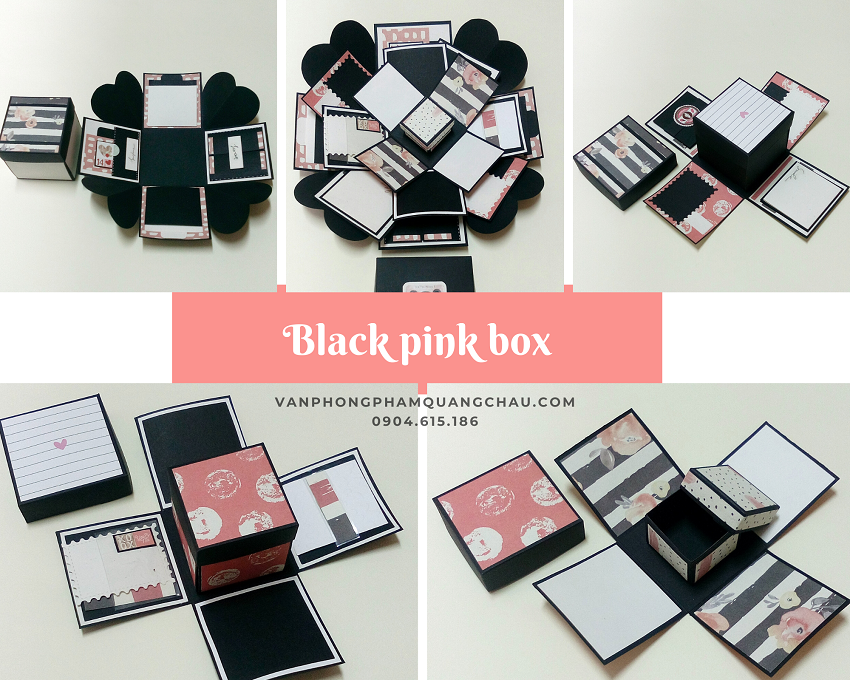 Exploding box tông hồng đen cùng giấy họa tiết lạ mắt. Chiếc hộp được thiết kế dưới dạng "box in box" hay "hộp trong hộp" để bạn khám phá từ từ từng lớp :3 Gây tò mò cho người nhận luôn hihi